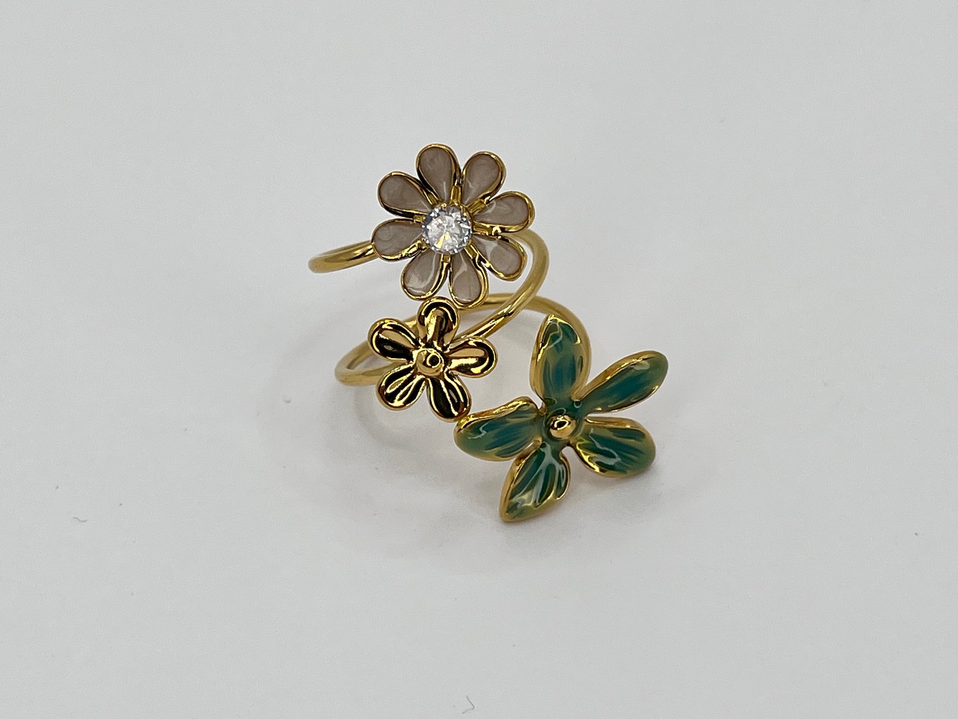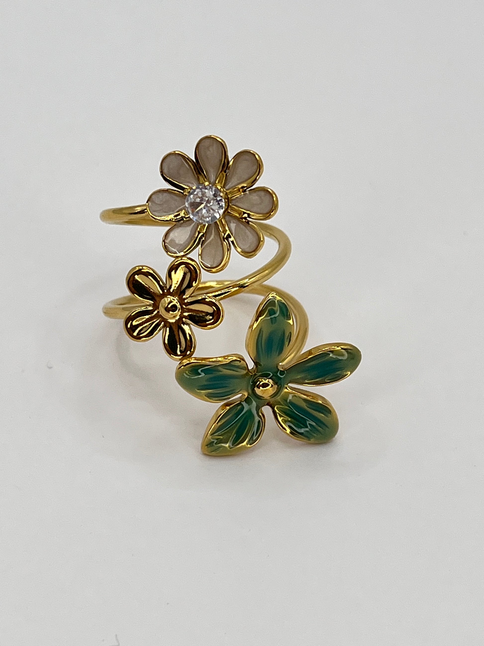 💛 Une bague symbolique, célébrant la diversité et la beauté naturelle à travers trois fleurs en parfaite harmonie.