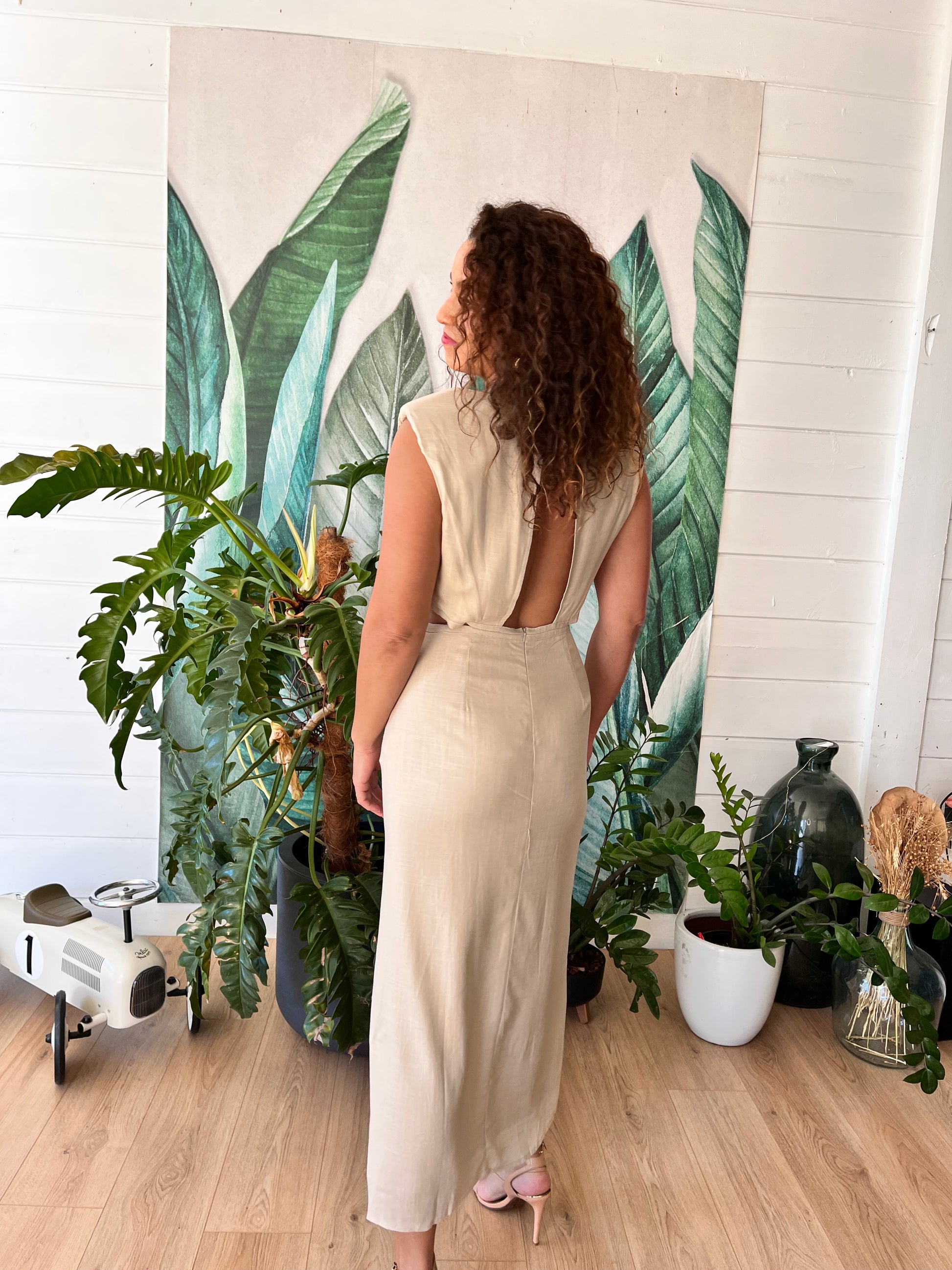 Découvrez notre magnifique robe midi sans manches en lin mélangé, parfaite pour toute occasion ! Avec son col rond élégant rehaussé d'épaulettes, ses détails découpés à la taille et à l'arrière, cette robe est un véritable bijou de mode. Sa coupe trapèze flatteuse et sa fente à la base apportent une touche d'élégance supplémentaire. La fermeture éclaire au dos et le bouton élastique au nuque assurent un ajustement parfait. Disponible en couleurs beige.